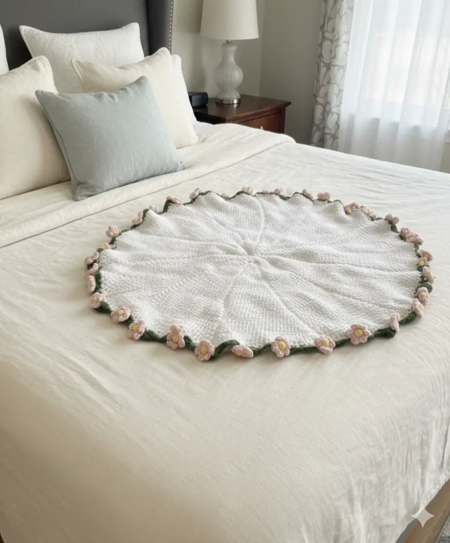 Le produit consiste en une couverture composée de motifs floraux en relief, reliés par des éléments textiles de couleur verte, assemblés sur une base textile de couleur claire.